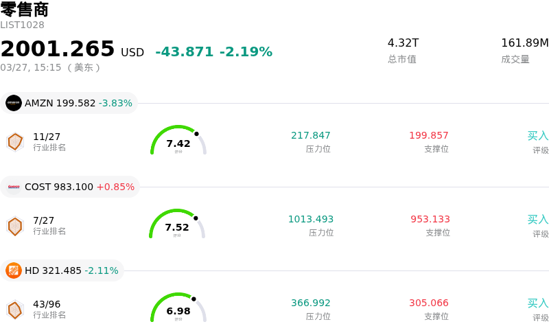 TJX Companies Inc (TJX) 盘中下跌3.15%, 所属行业零售商下跌2.19% ,公司涨幅跑输行业涨幅,行业成交额前三股票 亚马逊 (AMZN) 下跌 3.83%;开市客 (COST) 上涨 0.85%;家得宝 (HD) 下跌 2.11%。