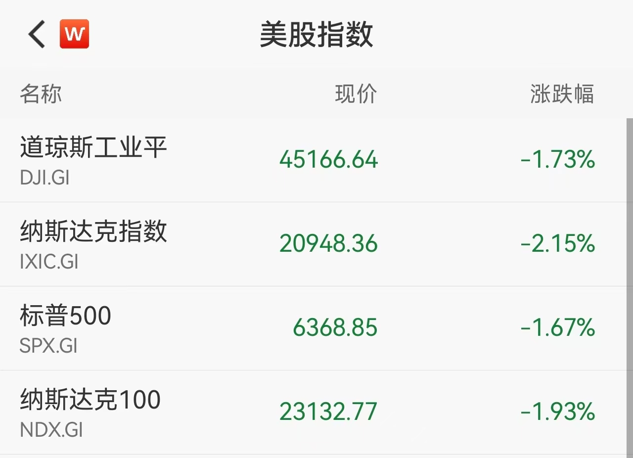 在地缘冲突升级与油价暴涨的双重冲击下,美股市场迎来新一轮抛售潮,三大指数全线大幅收跌,且悉数录得周线五连跌。截至收盘,道琼斯工业平均指数下跌1.73%,报45166.64点;纳斯达克综合指数下跌2.15%,报20948.36点;标普500指数下跌1.67%,报6368.85点,一周之内接连失守6500点与6400点两大整数关口。继此前纳指跌入技术性调整区间后,道指也在本周正式进入调整区间。