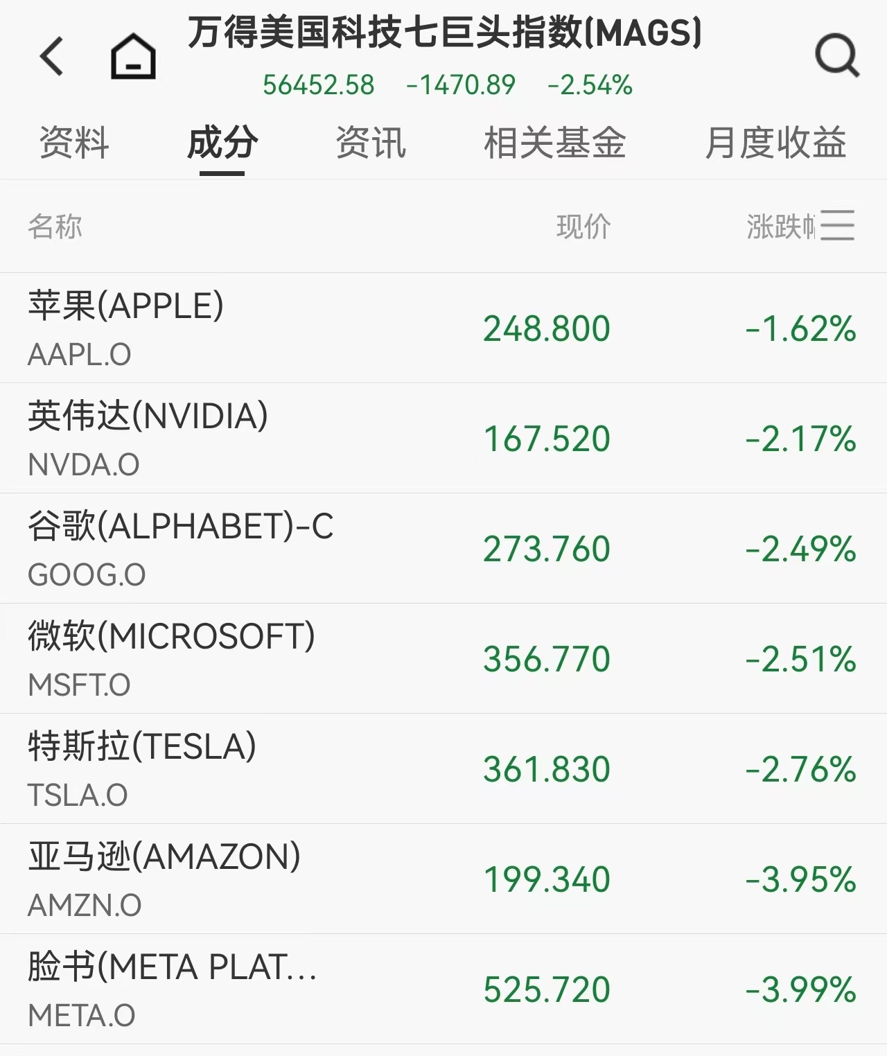 盘面上,美股科技巨头普跌,成为拖累大盘的主要力量。截至收盘,Meta、亚马逊跌近4%,微软跌2.51%,谷歌-A跌2.34%,英伟达跌2.17%,苹果跌1.62%,特斯拉、博通均跌超2%。其中微软在连续4日下跌后,较去年10月的历史高点回撤幅度已接近34%,在科技 “七巨头” 中表现尤为疲软。