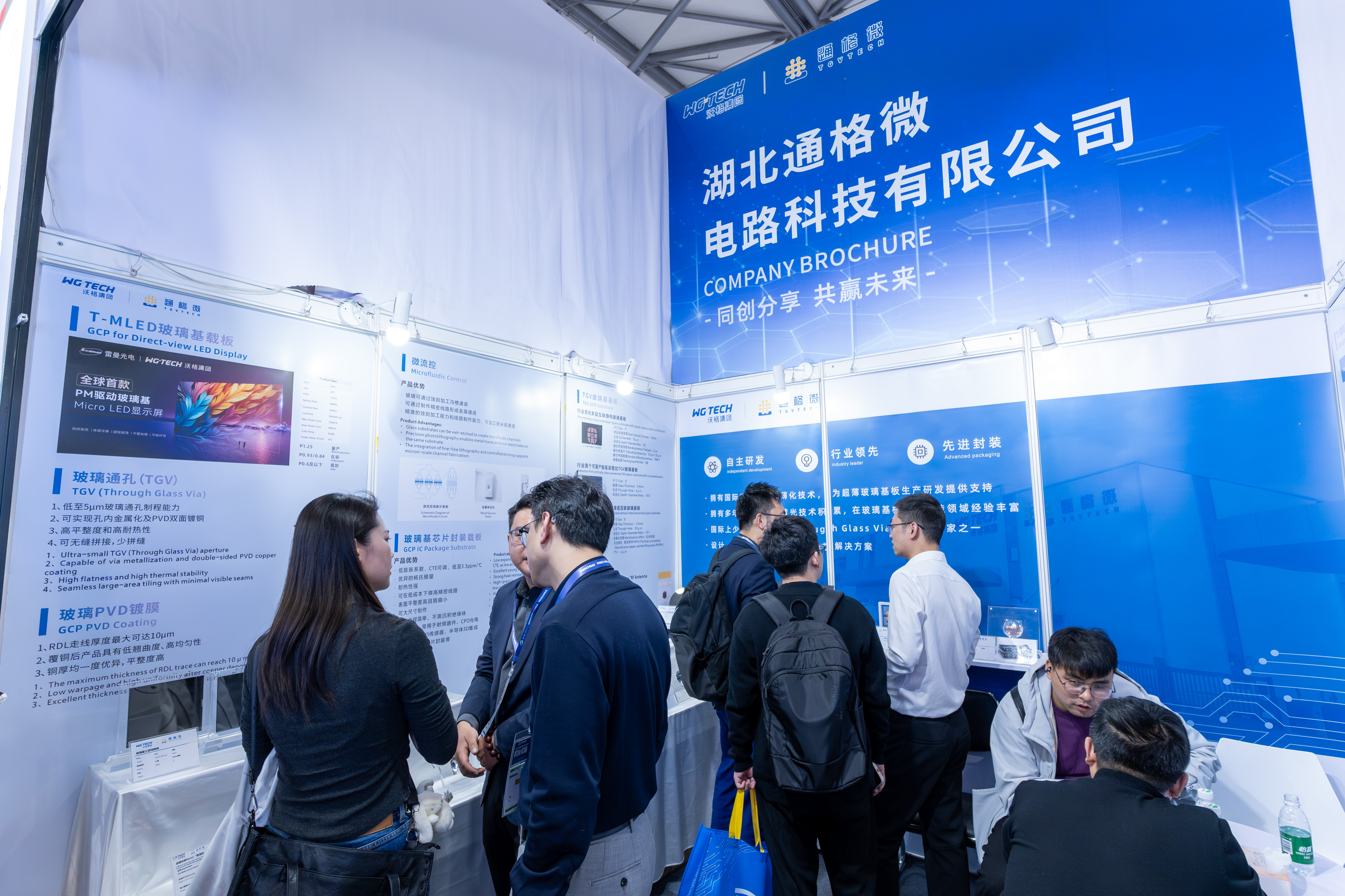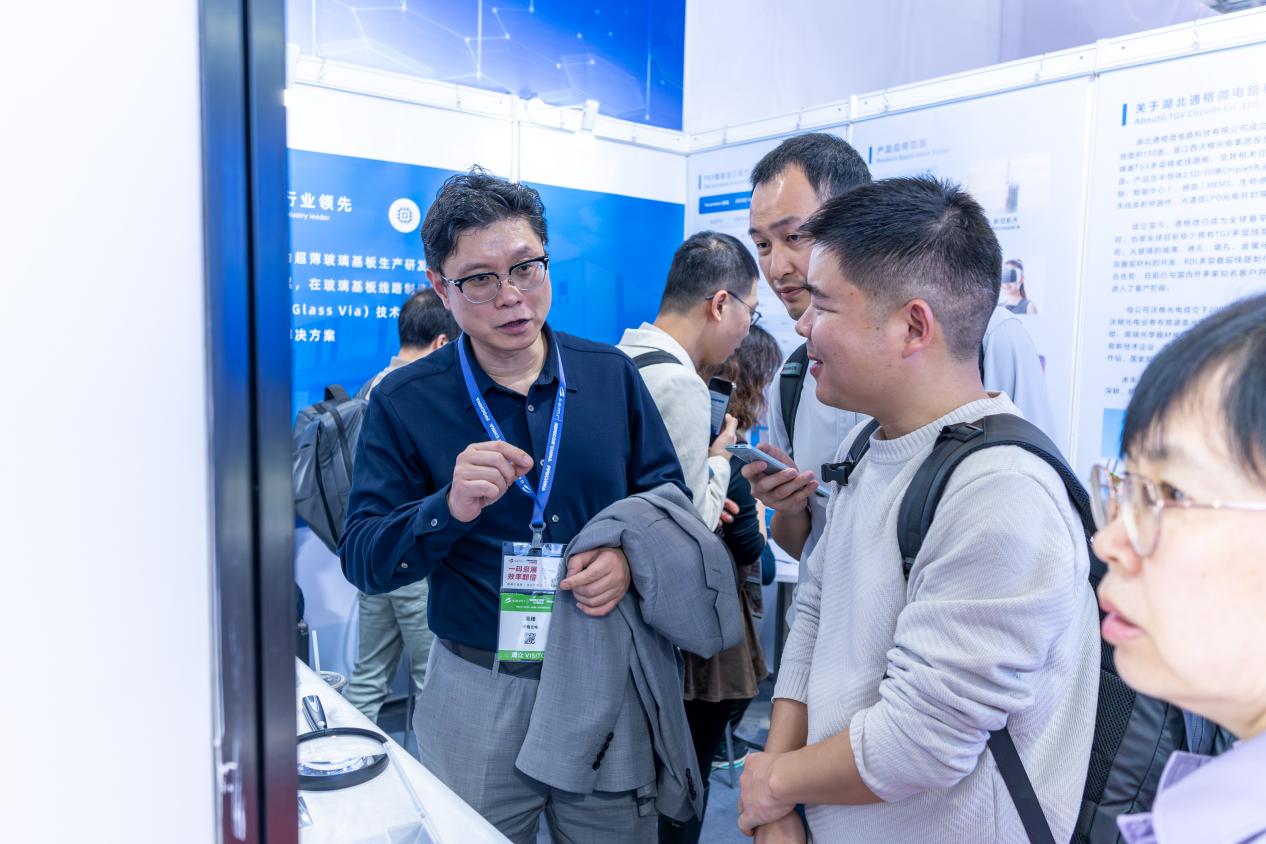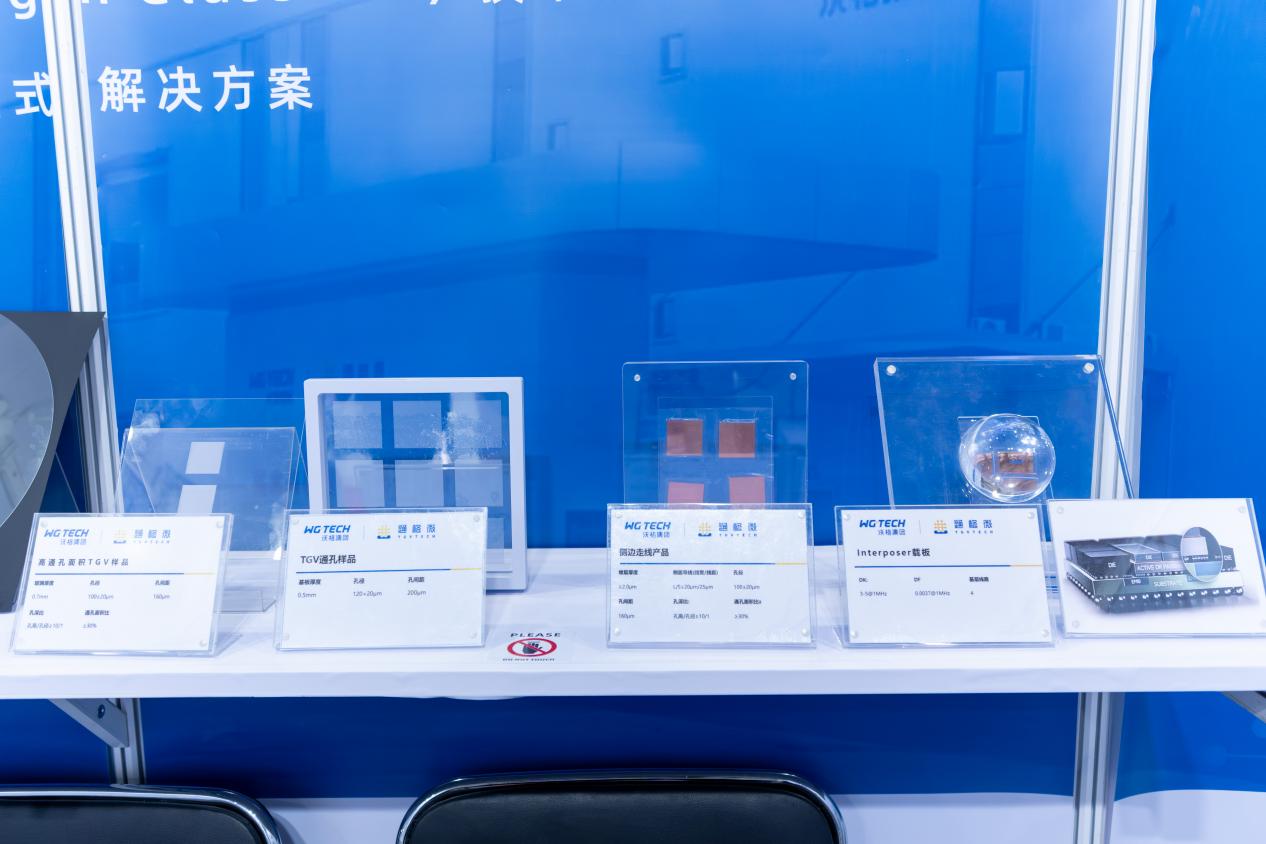 通格微集中展示了基于自主核心GCP(玻璃线路板)技术的多类型TGV玻璃基产品,涵盖三层线路板、微流控载板、MIP封装载板、Micro LED直显模组、多层堆叠玻璃基板、侧边走线玻璃基板、四层线路interposer玻璃基板等品类,涉及半导体先进封装、通信、微流控、新型显示等应用领域。其中,首次亮相的可量产超高深宽比TGV玻璃基板作为通格微最新技术进展的代表,吸引了众多行业专业人士的高度关注。
