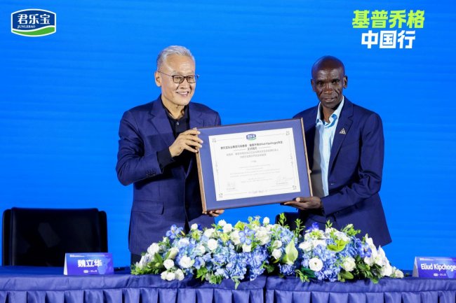 基普乔格表示,他由衷敬佩魏立华先生,不仅完成了全球马拉松六大满贯赛事,同时作为一位成功的企业家,三十多年来坚守乳业,带领君乐宝以世界级品质筑牢营养根基。“很荣幸成为君乐宝全球品牌代言人,当我走进君乐宝,看到世界级的设备、研发和管理,我放心了。我为我的孩子高兴,为所有肯尼亚的孩子感到开心。”他说,未来将与君乐宝并肩同行,让来自君乐宝的科学营养走向世界,助力全球儿童健康成长、突破自我。