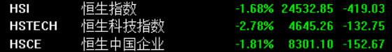 港股开盘,港股恒生指数跌1.68%,报24532.85点,恒生科技指数跌2.78%,报4645.26点,国企指数跌1.81%,报8301.1点,红筹指数跌1.07%,报4119.66点。