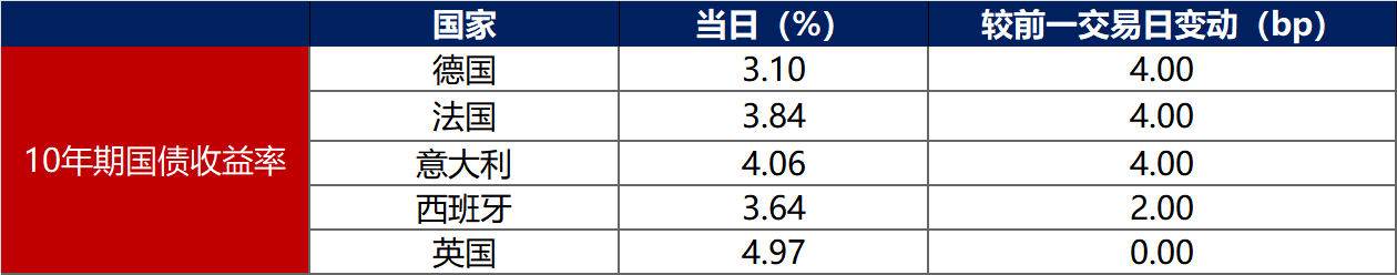 3月27日,英国10年期国债收益率保持不变,其余主要欧洲经济体10年期国债收益率普遍上行。其中,德国10年期国债收益率上行4bp至3.10%,法国、意大利、西班牙10年期国债收益率分别上行4bp、4bp和2bp。