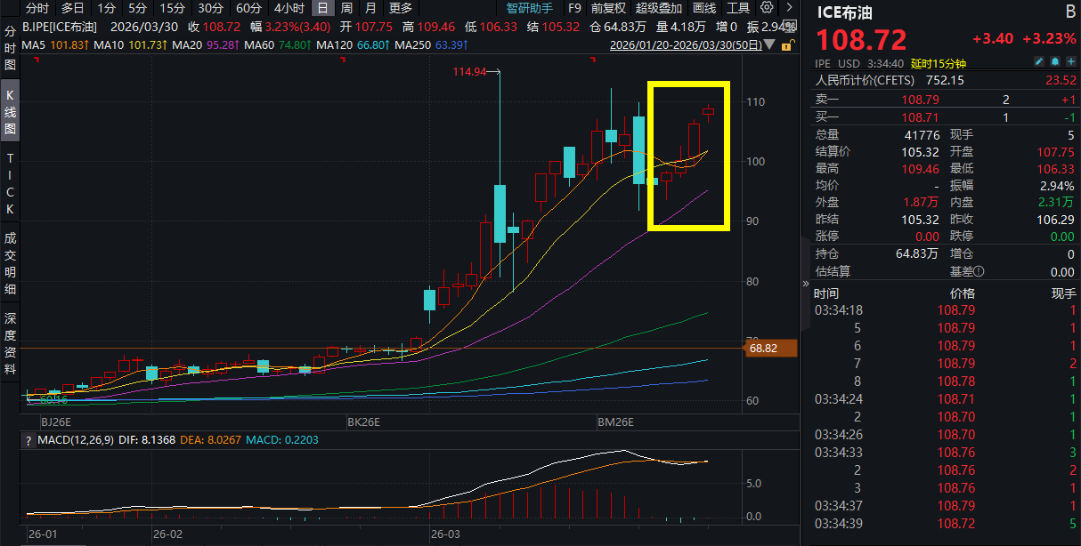 3月30日盘中,油价继续冲高ICE布油涨超3%,冲击三连涨。