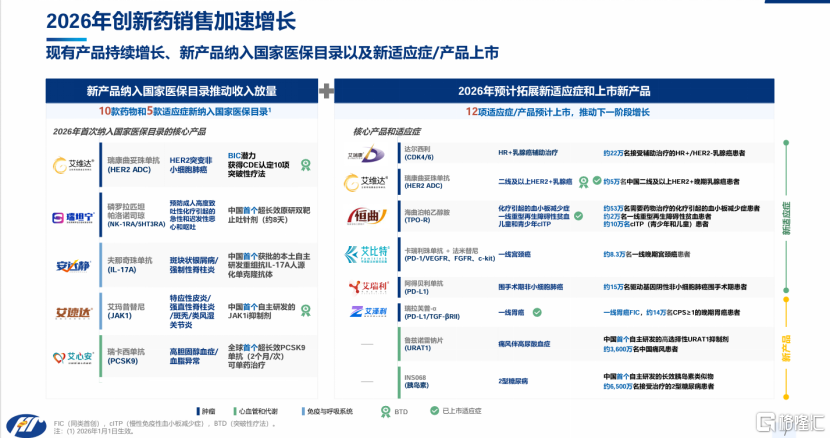 这意味着,像瑞康曲妥珠单抗等具备重磅潜力的新品,将首次享受医保报销的放量红利。以瑞康曲妥珠单抗为例,这款HER2ADC药物在2025年5月获批上市后,凭借优异的临床数据迅速打开市场,2026年进入医保后有望迎来爆发式增长。正是基于此,管理层给出了2026年创新药销售收入同比增长超30%的明确指引,彰显了对新一年增长的坚定信心。
