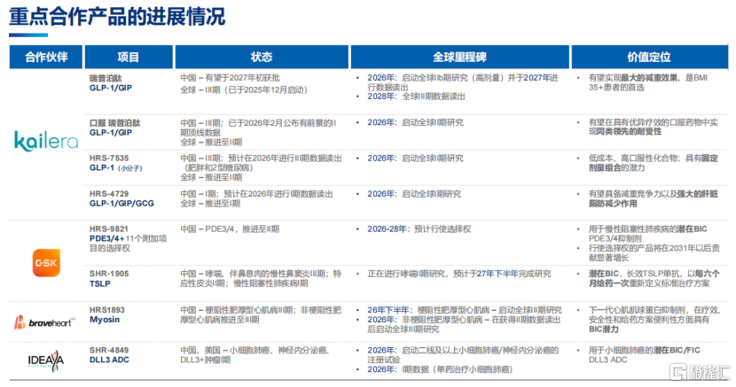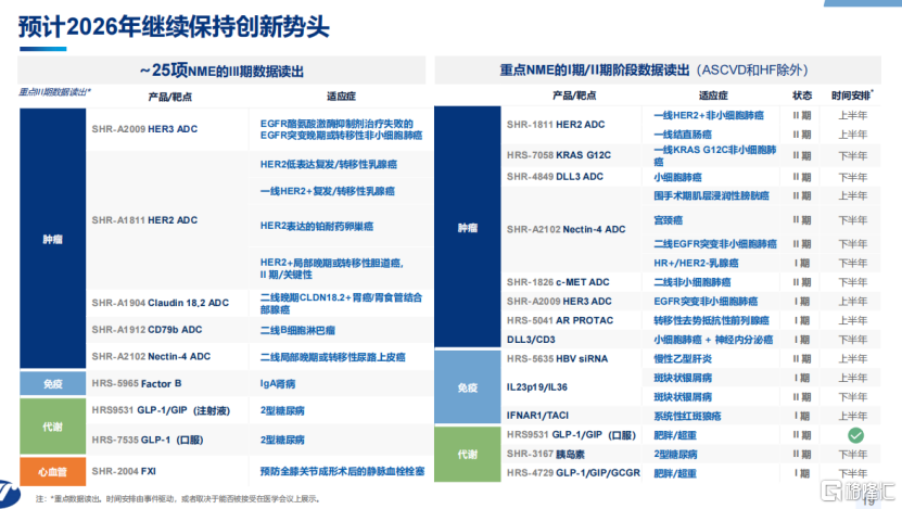 其中包括具备同类最佳潜力的GLP-1/GIP双受体激动剂瑞普泊肽(HRS9531)用于超重/肥胖有望获批;瑞康曲妥珠单抗有望获批用于HER2阳性结直肠癌、一线乳腺癌等多个新适应症。