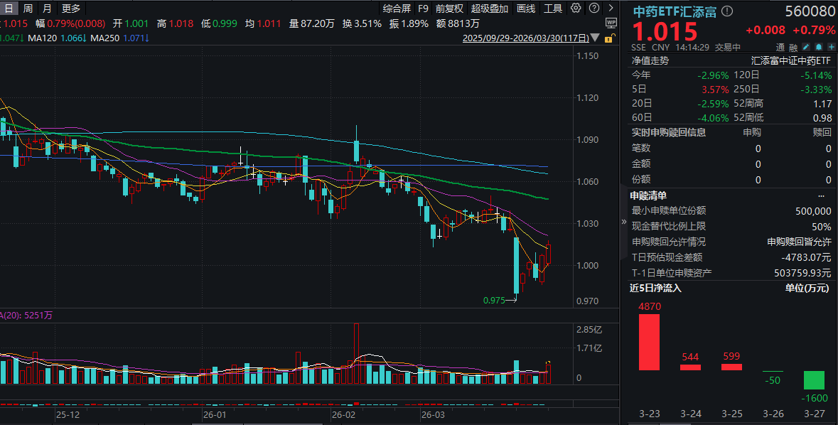 今日(3.30),沪指午后探底回升,中药板块连续第二日飘红。中药ETF汇添富(560080)放量涨近1%,盘中成交额已逼近9000万元,超过上一交易日全天成交额。资金面上,中药ETF汇添富(560080)近5日有3日获净流入,近60日累计“吸金”超1.4亿元!