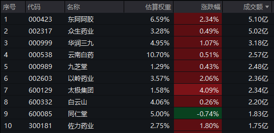 中药ETF汇添富(560080)标的指数热门股多数飘红:太极集团涨超4%,东阿阿胶、以岭药业涨超2%,华润三九、佐力药业涨超1%,众生药业、云南白药、九芝堂、白云山微涨。