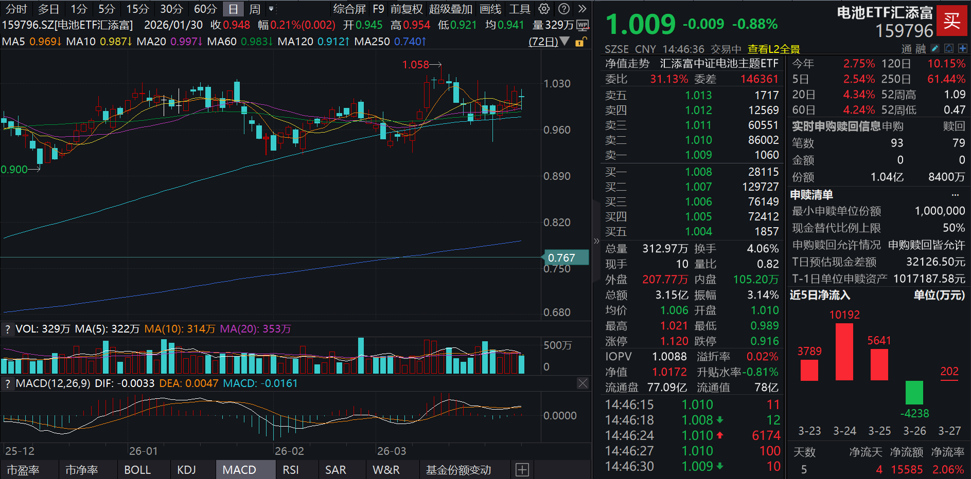 3月30日,A股市场午后小幅回暖,上证指数探底回升成功翻红,新能源板块承压。截至14:46,同类费率最低档的光伏ETF汇添富(516290)跌超3%,此前已连续2日吸金超550万元同类规模领先、费率最低档的电池ETF汇添富(159796)跌近1%,成交额超3.2亿元,交投活跃,盘中资金涌入超1900万元,同样连续两日吸金,近五日累计吸金1.6亿元