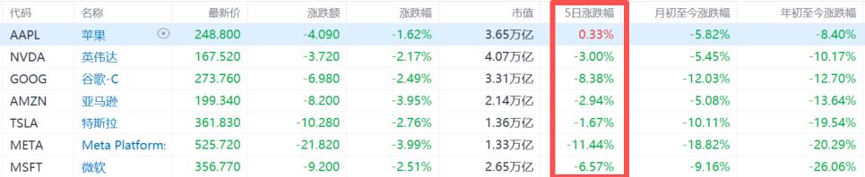 微软周跌6.5%,英伟达与亚马逊上周分别跌约3%,特斯拉跌幅近2%,唯苹果小幅微涨。