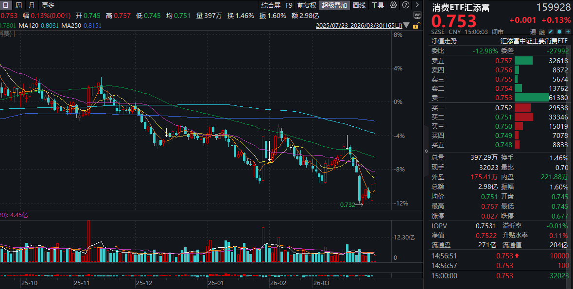 今日(3.30),A股午后探底回升,在亚太股市中独树一帜,大消费板块再度收红,消费ETF汇添富(159928)实现两连阳,成交额近3亿元!资金面上,近60日净流入超1.6亿元!消费ETF汇添富(159928)最新规模超204亿元,同类持续领先!