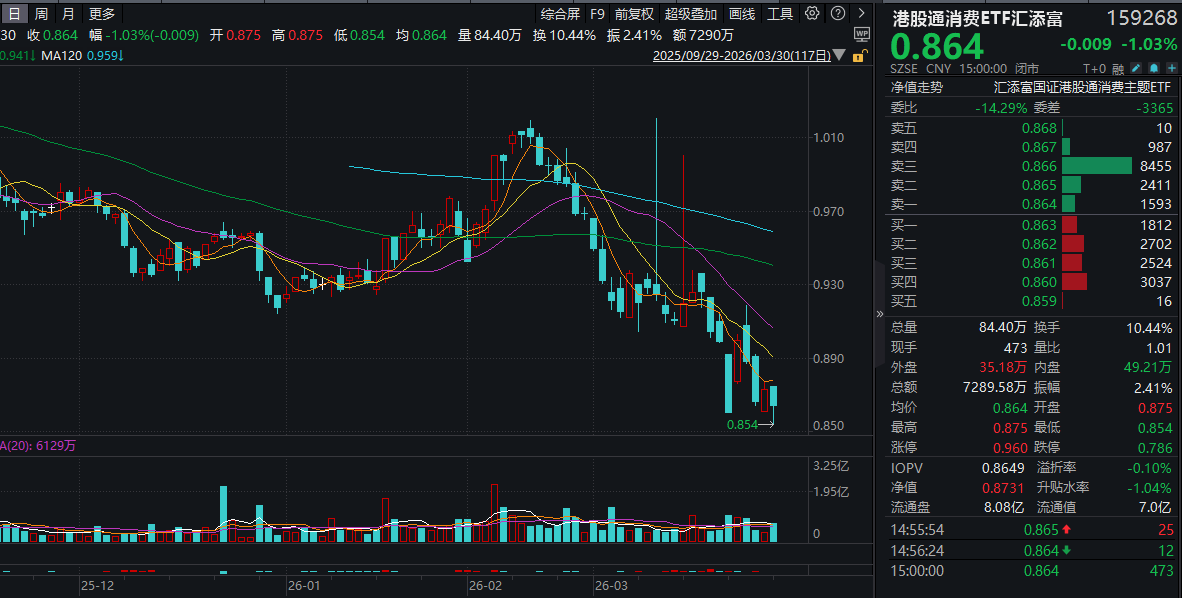港股消费方面,聚焦纯正新消费的港股通消费ETF汇添富(159268)回调超1%,全天放量成交超7200万元!资金面上,近10日净流入超1500万元。