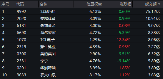 港股通消费ETF汇添富(159268)标的指数热门股涨跌互现,TCL电子涨超12%,华润啤酒、农夫山泉涨超1%,老铺黄金、蒙牛乳业微涨;下跌方面,海尔智家跌超5%,泡泡玛特、安踏体育微跌。