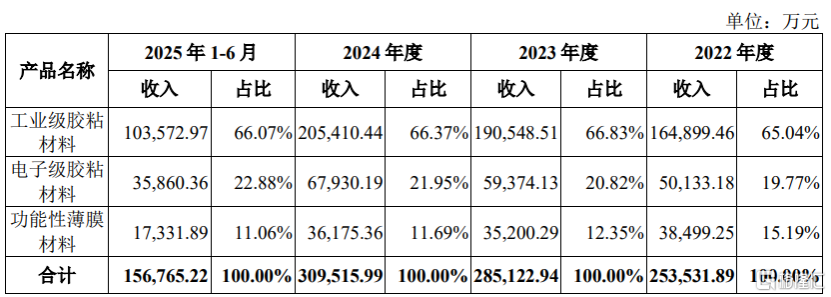 具体来看,2022年至2025年1-6月(简称“报告期”),工业级胶粘材料为公司贡献了65%以上的营收,电子级胶粘材料的营收占比在20%左右,功能性薄膜材料的营收占比从约15%降至11%。