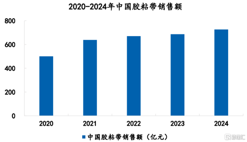 其中,据中国胶粘剂和胶粘带工业协会统计数据,2024年我国胶粘带市场销售额为726亿元,2020年至2024年的复合增长率为9.73%。