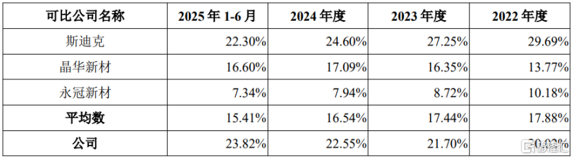 报告期内,皇冠新材的综合毛利率分别为20.02%、21.7%、22.55%和23.82%,其毛利率水平高于同行业上市公司平均值。