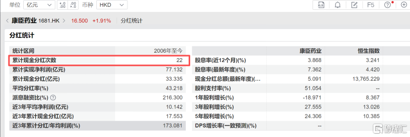 在整个医药行业中,能够持续稳定分红并保持较高派息比例的企业并不多。Wind数据显示,上市以来,康臣药业累计分红22次,年均分红比例超过30%,平均分红率达43.22%。