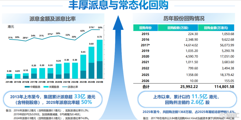 根据公司公告,2025年合计派息每股0.73港元,其中中期股息每股0.33港元、末期股息每股0.40港元,派息率超过50%。自上市以来,公司累计派息金额超33亿港元(含特别股息)。