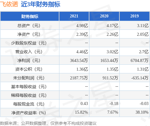 从目前公布的财报来看,飞依诺2021年总资产为4.98亿元,净资产为2.39亿元;近3年净利润分别为3643.54万元(2021年),1653.44万元(2020年),6704.87万元(2019年)。详情见下表:
