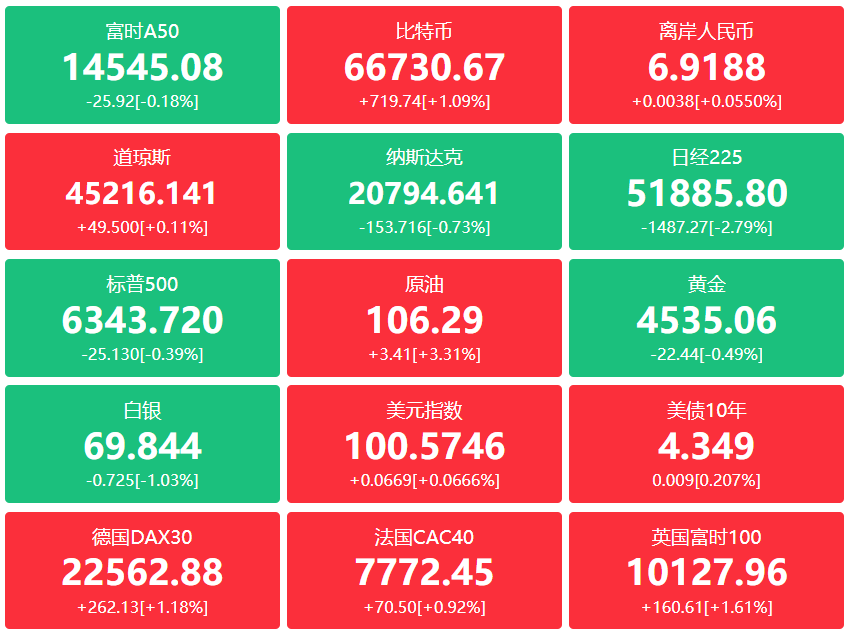 纽约商品交易所5月交货的轻质原油期货价格上涨3.24美元,收于每桶102.88美元,涨幅为3.25%;5月交货的伦敦布伦特原油期货价格上涨21美分,收于每桶112.78美元,涨幅为0.19%。现货黄金收于4511.18美元,现货白银收于70.091美元。