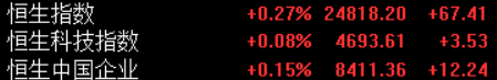 港股恒生指数开盘涨0.27%,报24818.2点,恒生科技指数涨0.08%,报4693.61点,国企指数涨0.15%,报8411.36点,红筹指数涨0.05%,报4148.6点。个股方面,极兔速递-W涨9.91%,博泰车联涨7.04%,三一国际涨5.08%,智云科技建设涨4.32%,美的集团涨4.08%;小马智行-W跌6.92%,中国联塑跌5.62%,兆易创新跌4.86%,长飞光纤光缆跌4.47%,中国交通建设跌4.44%。