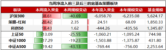 具体到细分板块,宽基&策略板块ETF中,净流入前三大板块依次为:沪深300、策略-红利、科创50;净流出前三大板块依次为:中证A500、中证1000、上证50。