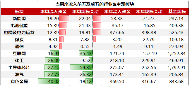 行业&主题板块ETF中,净流入前五大板块依次为:新能源、电池储能、电网及电力运营、煤炭、通信;净流出前五大板块依次为:有色金属、油气、半导体芯片、化工、互联网。
