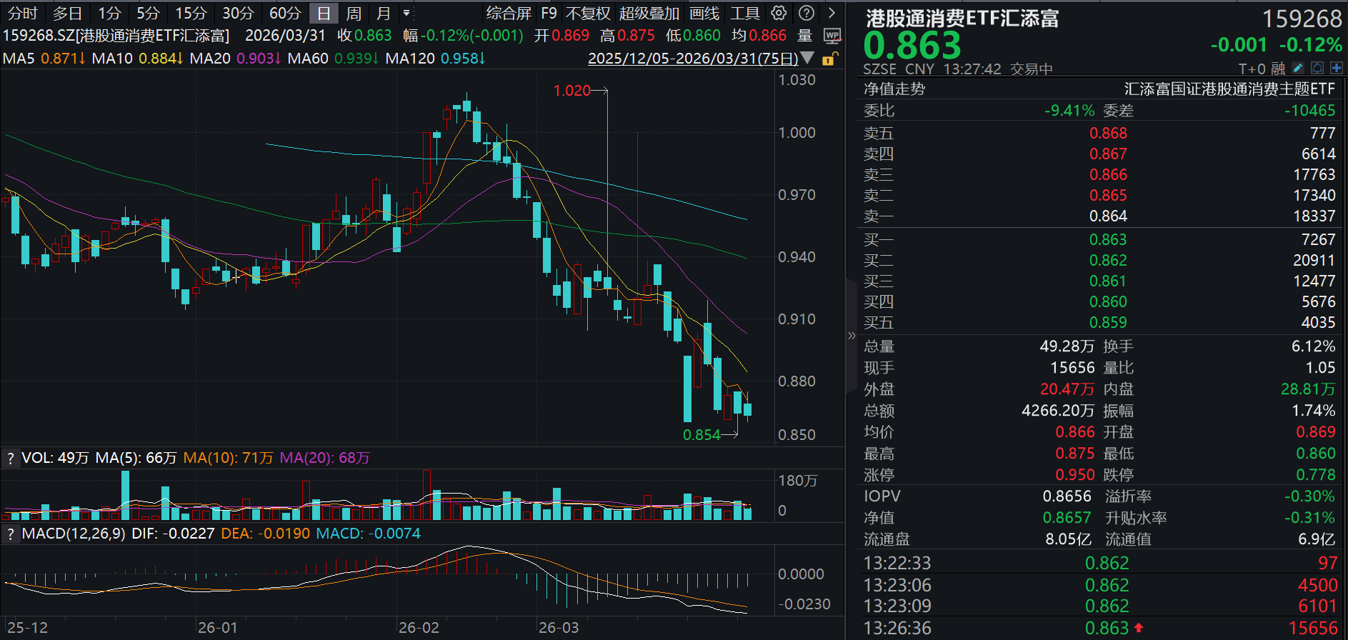 港股消费方面,聚焦纯正新消费的港股通消费ETF汇添富(159268)微跌0.12%,盘中成交额已超4200万元!资金面上,近20日净流入超1300万元。