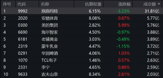 受业绩催化,美的集团逆市涨近6%,港股通消费ETF汇添富(159268)标的指数其他成分股中,安踏体育、华润啤酒、TCL电子微涨;下跌方面,泡泡玛特跌超3%,蒙牛乳业跌超1%,老铺黄金、海尔智家微跌。