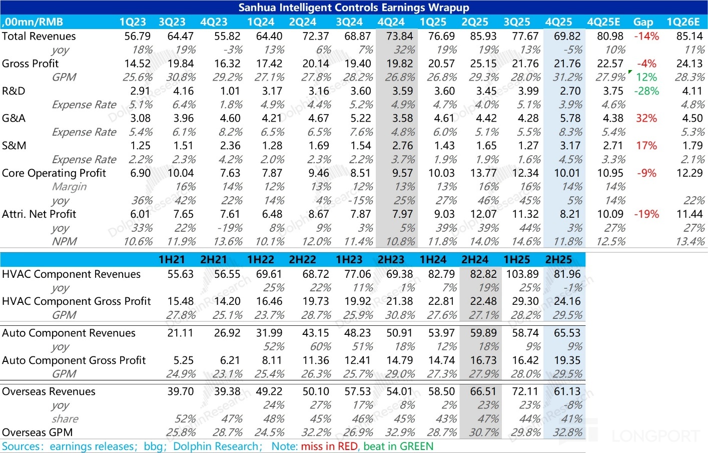 而收入低于预期主要来自海外市场——制冷受到美国贸易政策影响,汽零受到大客户特斯拉销量波动影响,公司之前对大客户销售情况过于乐观。另外就是国内制冷业务受到 24 年以来国补政策导致的高基数的影响。