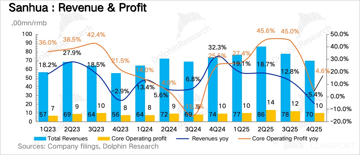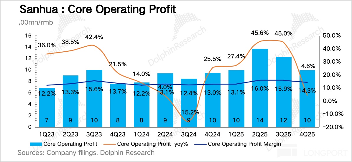 另外与此同时,在制冷板块的部分细分领域,三花表现不错:在商用领域,2025 年浙江三花商用制冷有限公司营收 30.6 亿元,同比增长 26%,净利润 5.88 亿元,同比增长 38%;数据中心液冷领域,如上所述,营收 14 亿元,同比增长约 40%。