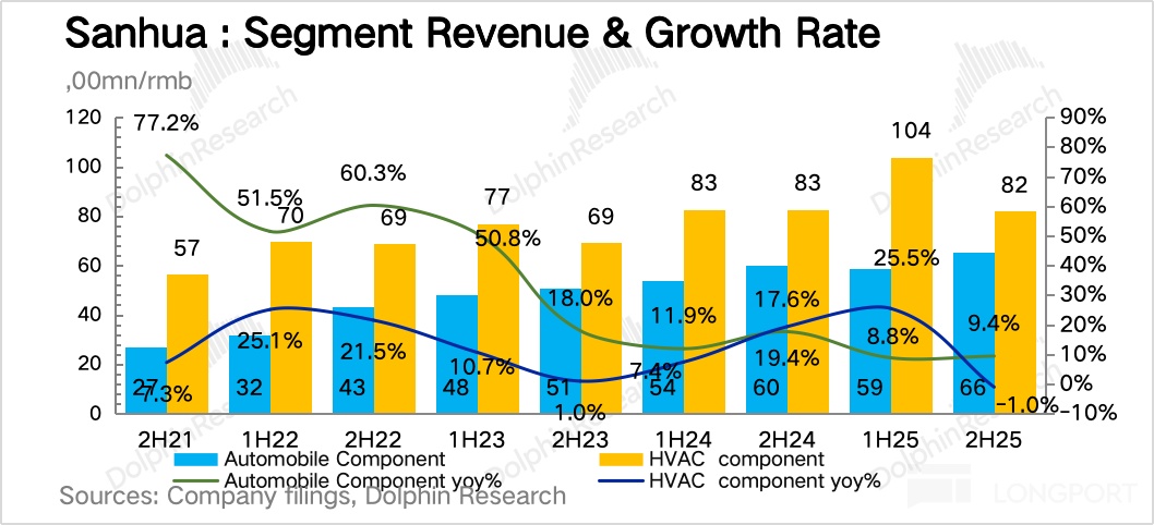 事实上,考虑到关税政策影响和国补所带来的高基数,整个下半年制冷业务 1% 的同比跌幅表现已算不错,更不用说汽零业务在特斯拉 Q4 收入负增长下仍实现近乎同比持平的收入。