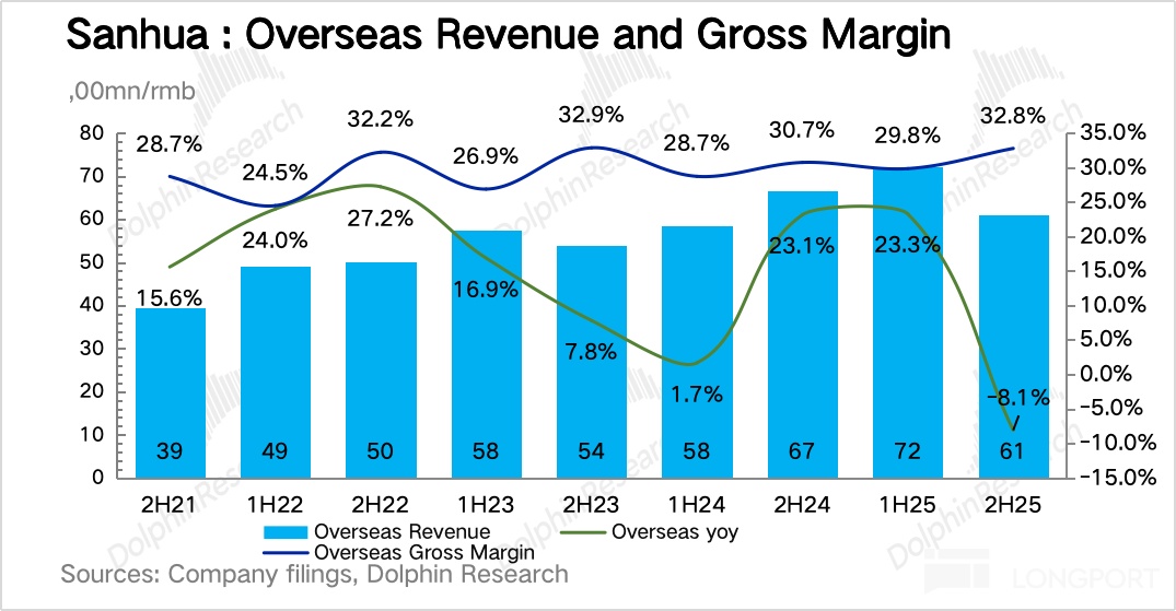 就下半年来看,三花 25 年下半年海外收入 61 亿元,同比下滑了 8%,绝对值同比下滑了约 6 亿元。