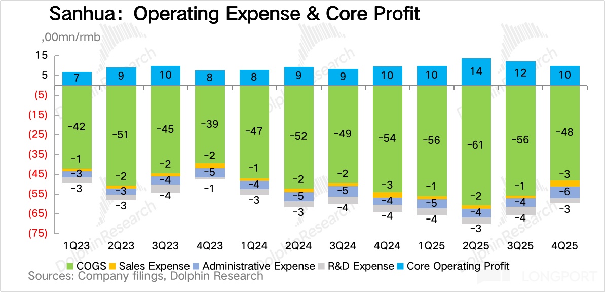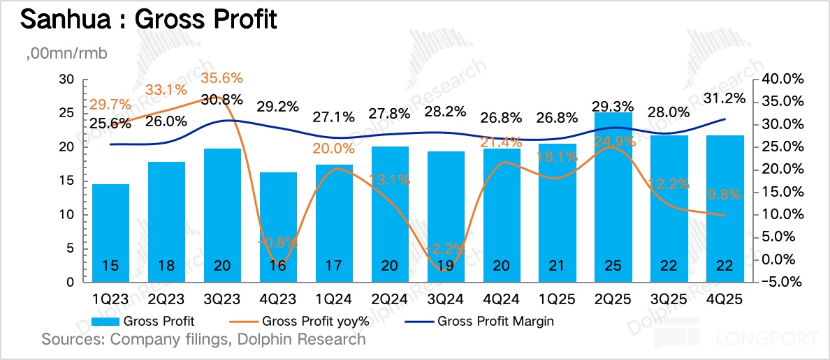 三花 Q4 单季毛利只有 22 亿,低于市场预期,主要是受收入不及预期的影响,但毛利率 31.2% 却创了新高,同比拉高 4pct,环比也提升 3pct。