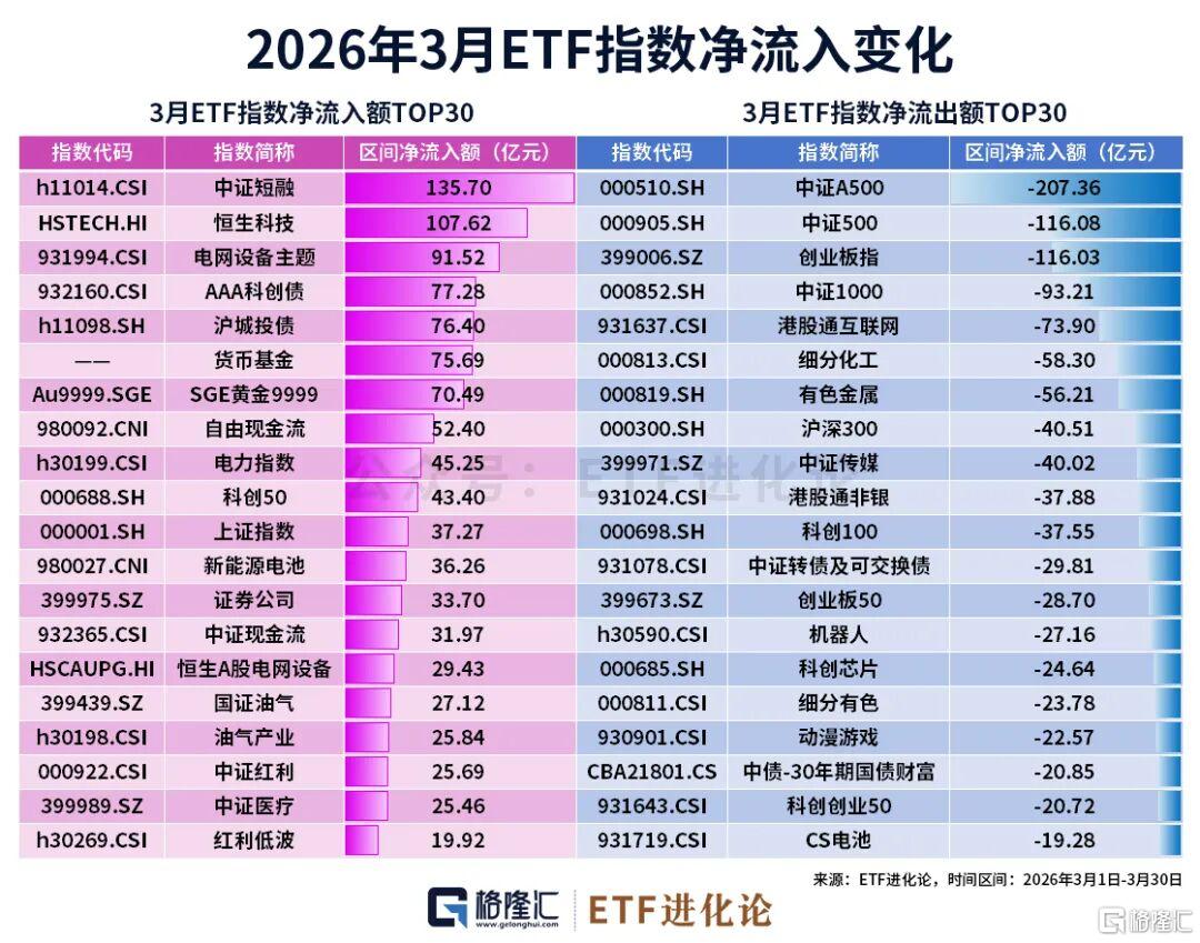一季度资金大幅流出核心宽基、固收成长与高波动赛道:沪深300、上证50、中证500、中证1000等核心宽基净流出均超900亿。