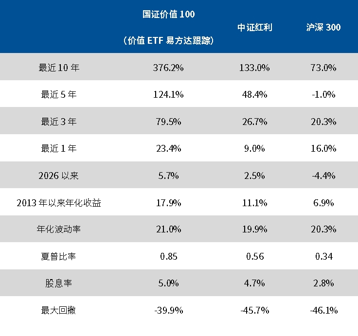 提到高股息投资,投资者往往会想到中证红利、红利低波等经典指数。而国证价值100指数在2026年3月完成季度调样后,股息率升至5.0%,高于中证红利的股息率4.7%与红利低波的4.6%。价值100指数凭借选股、调样的独特优势,实现“红利增强”的目标。跟踪该指数的价值ETF易方达(159263,联接A/C:025497 / 025498),也成为追求稳健收益投资者的关注焦点。