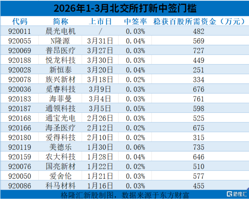发哥之前也说过,北交所打新不需要持有股票市值,但账户里要有足够的现金,申购多少股,就需要冻结多少资金。今年前三个月,北交所打新稳中100股所需资金在251万元至761万元之间。