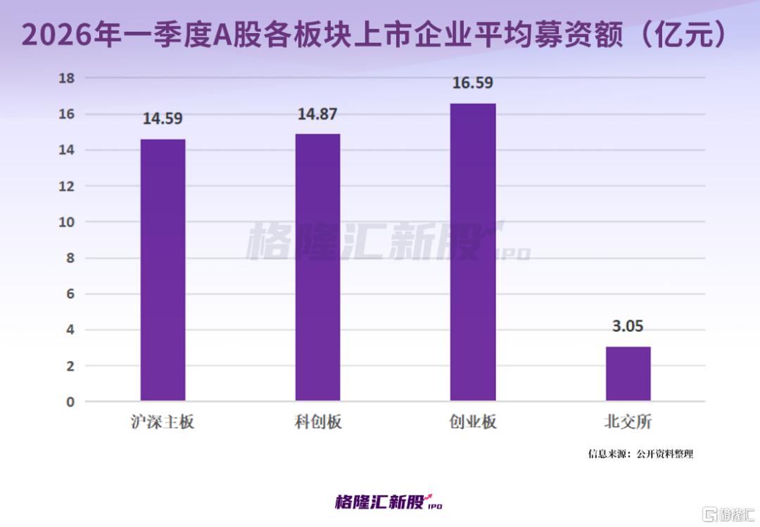 北交所以创新型中小企业为主,整体募资规模也较低,今年前三个月北交所上市新股首发平均募资额仅3亿元,明显低于A股其他板块。