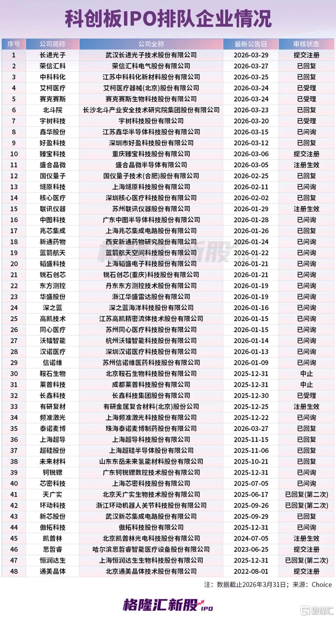 目前,A股注册制下仍有300多家在审企业(文末附各版块详细IPO排队名单),尤其是曾在春晚惊艳亮相的机器人公司宇树科技也在今年3月正式向科创板递交招股书,还有长鑫科技、华润控股、蓝箭航天、海康机器人等备受关注的大型IPO。