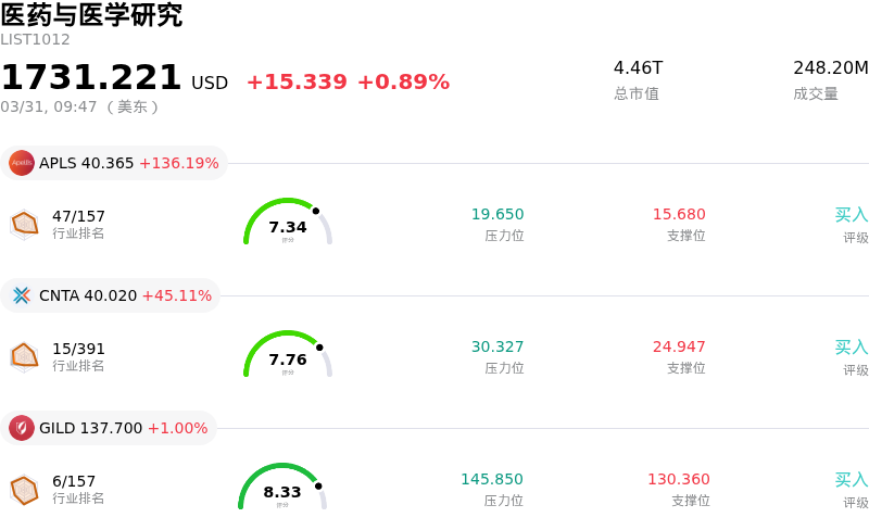 阿斯利康 (AZN) 开盘上涨3.38%, 所属行业医药与医学研究上涨0.89% ,公司涨幅跑赢行业涨幅,行业成交额前三股票 Apellis Pharmaceuticals Inc (APLS) 上涨 136.19%;Centessa Pharmaceuticals PLC (CNTA) 上涨 45.11%;吉利德科学 (GILD) 上涨 1.00%。