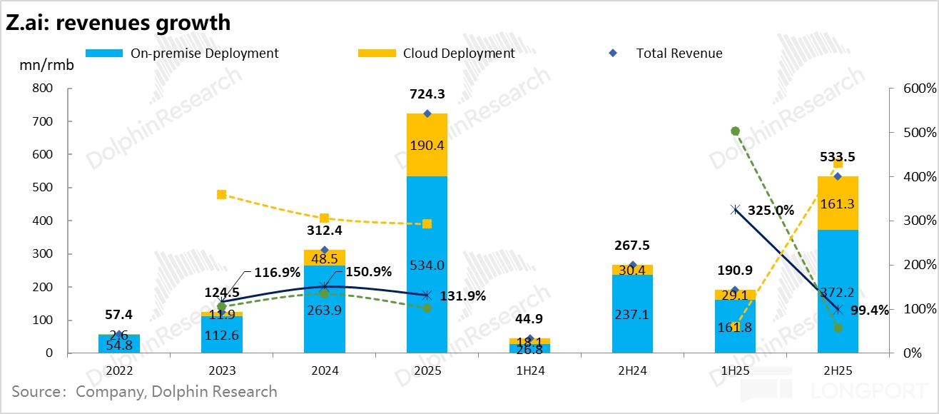 与此相反,市场真正喜闻乐见的 API 接口与开放平台这种云端部署业务下半年同比大幅增长 430%,达到了 1.6 亿。全年 API 类业务 1.9 亿的体量,与 MiniMax 的 1.8 亿基本不相上下。而且从增长斜率来看,智谱全年接近 300% 的增长,比 MiniMax 200% 更具爆发性。