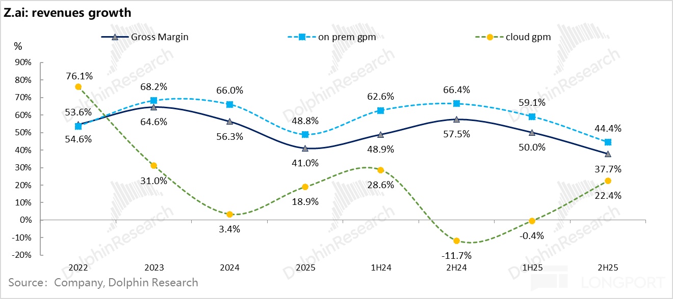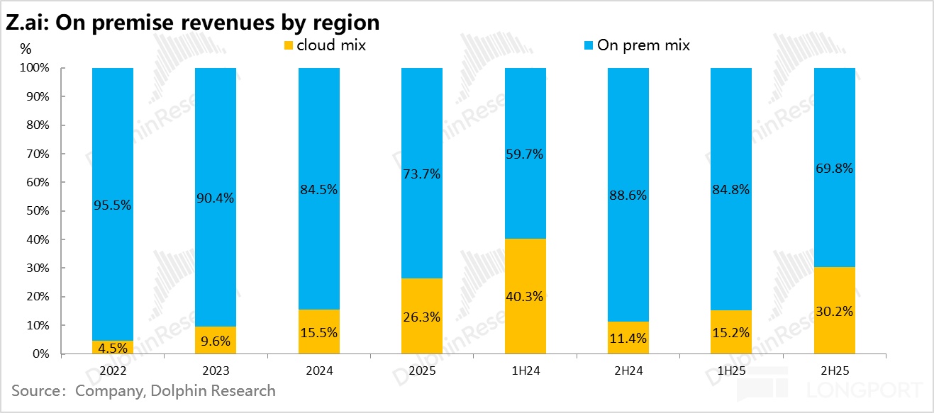 而放缓的主要原因确实应验了资金之前的担忧——收入占比 80% 本地部署业务,到了 2025 年下半年增长已经放缓到了 57%,只有 3.7 亿,占比也滑落到了 70%。