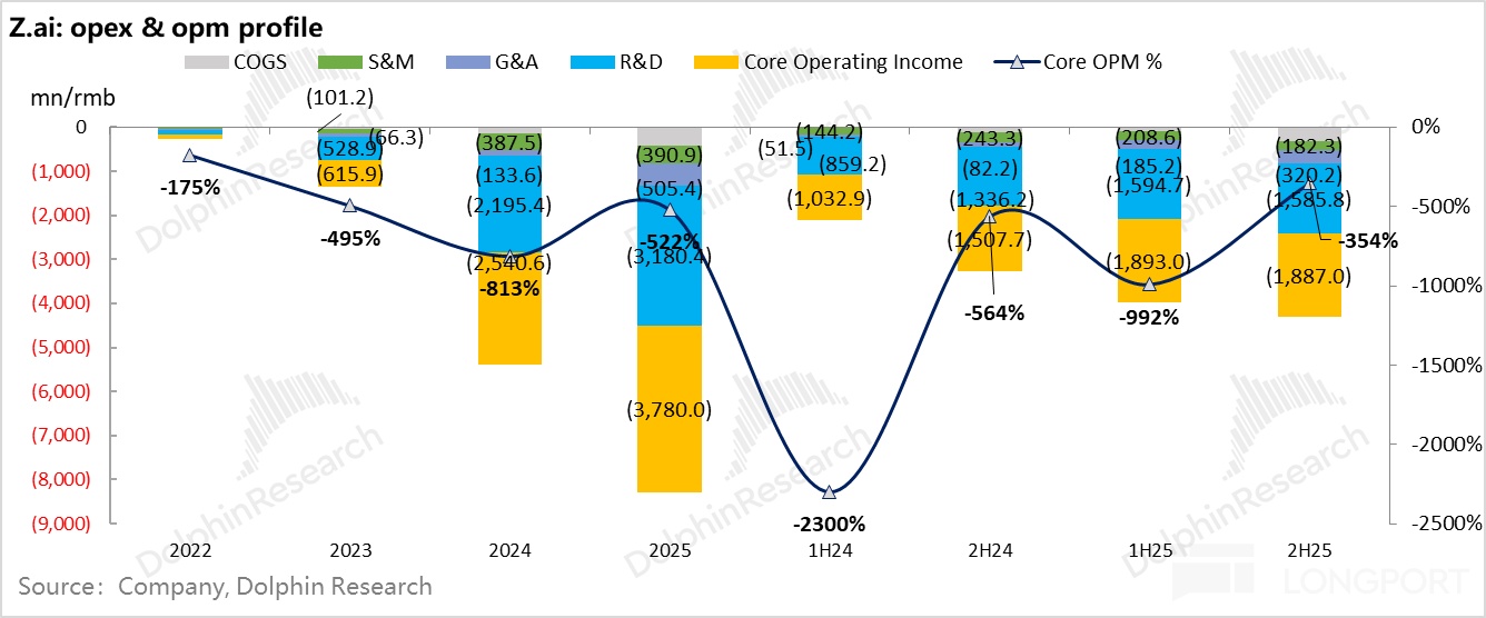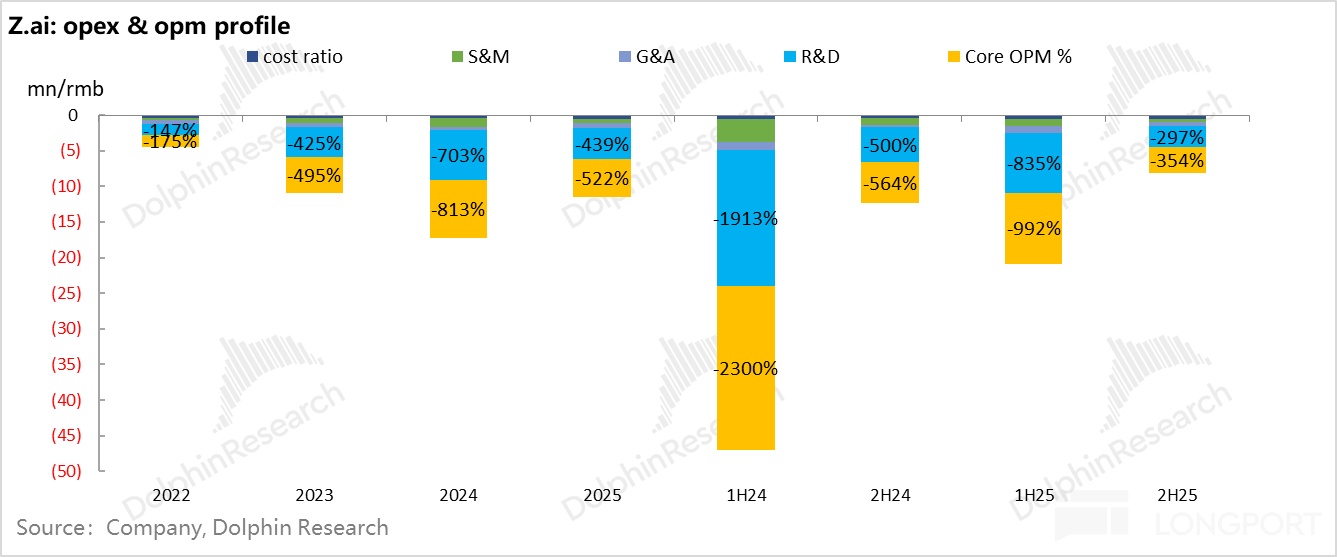 公司管理费用 3.2 亿,同比增长了 290%,相对较快;但与 MiniMax 一样,智谱销售费用同比负增长 25%,下半年仅仅 1.8 亿(同样是模型获客靠模型本身的能力,而不是靠营销)。