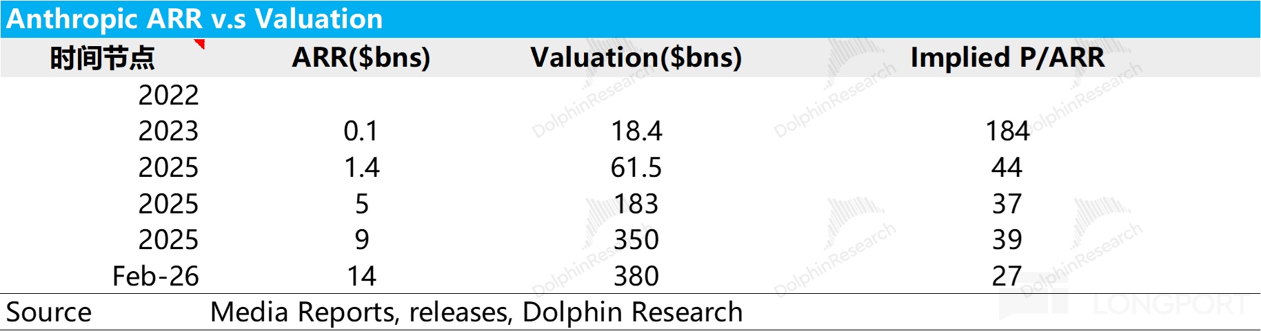 作为参考 Antropic 年化收入 14 亿美金时候,一级市场融资的估值是 615 亿美金。