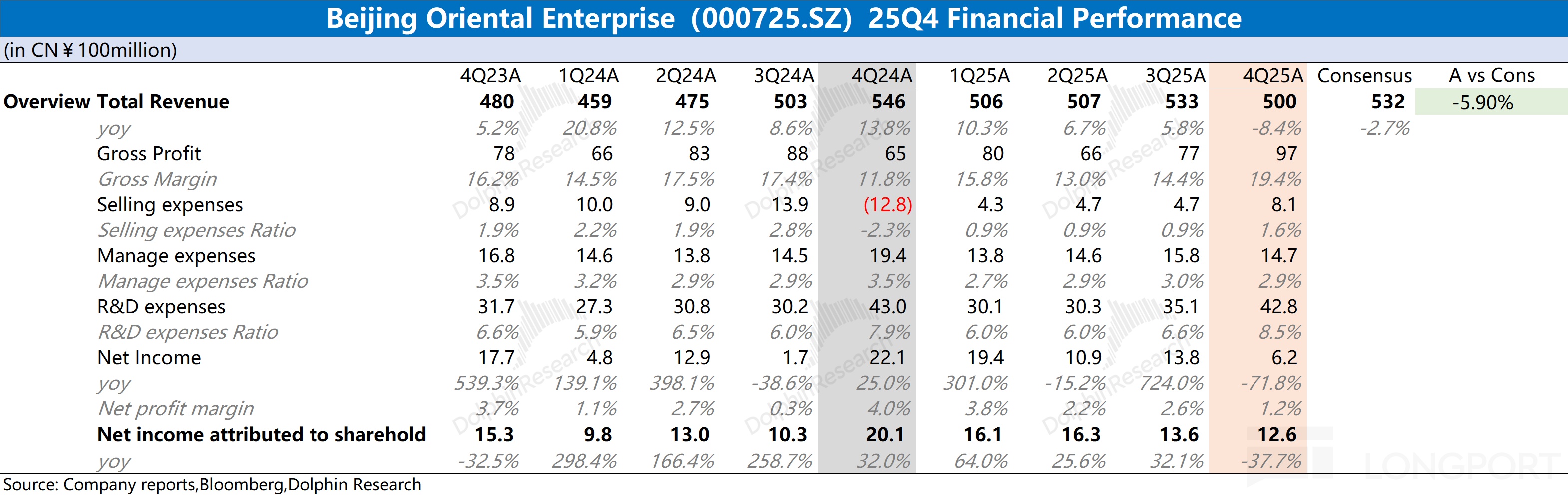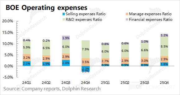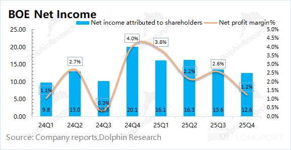 1.整体业绩:京东方 2025 年第四季度实现营收 500 亿元,同比下滑 8.4%。其中面板市场价格同比略有回落(约 1%),公司出货量下滑是主因。京东方 2025 年第四季度归母净利润为 12.6 亿元,这主要是受少数股东权益的影响。若剔除该影响,$京东方A(000725.SZ) 本季度净利润为 6.2 亿元,同比下滑 72% 左右,主要是受收入下滑、经营费用增加等因素影响