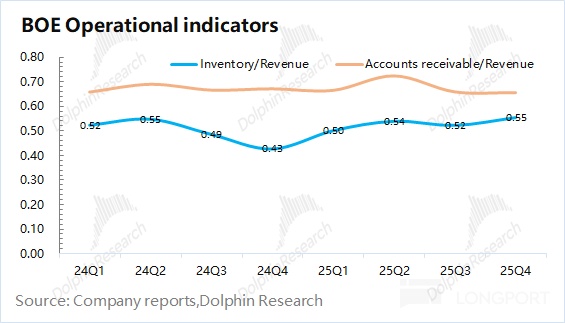 4.存货情况京东方在 2025 年第四季度的存货为 277 亿元,环比基本持平。公司本季度存货/收入的比值维持在 0.55,当前存货情况相对合理的平稳状态。