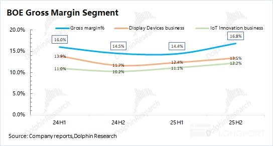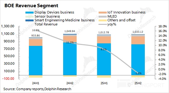 3.具体业务来看:显示器件和物联网创新业务是公司最大的收入来源,合计占比达到 95% 以上。其中 2025 年下半年显示器件业务同比下滑 1.6%,面板价格和出货都有一定的回落;物联网创新业务同比下滑 5.6 %,再次下滑,表明智慧零售、智慧办公等场景的需求依然偏弱。