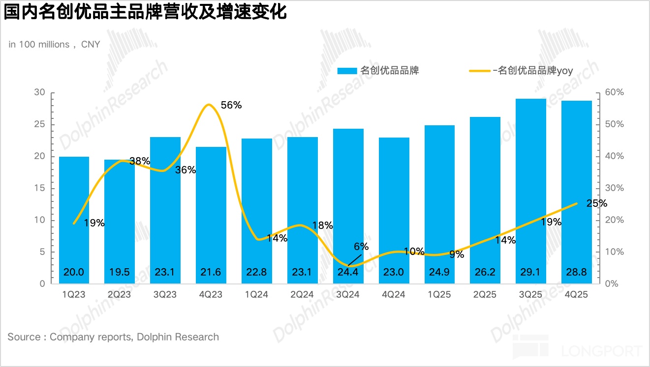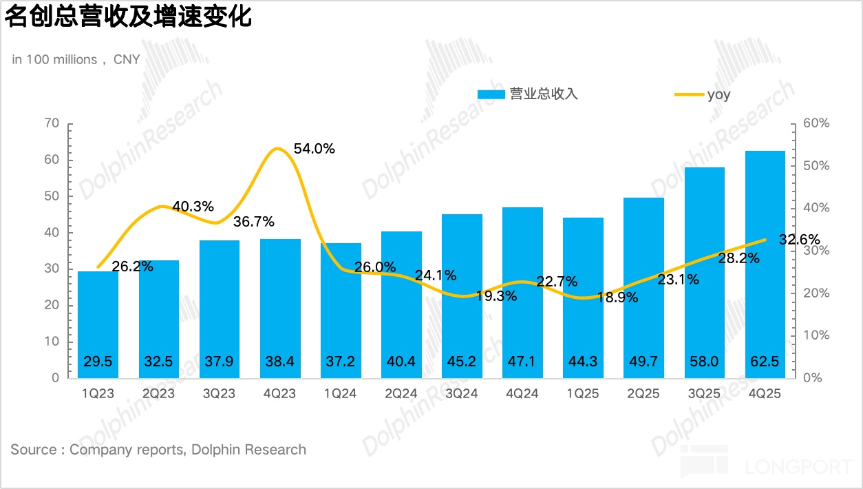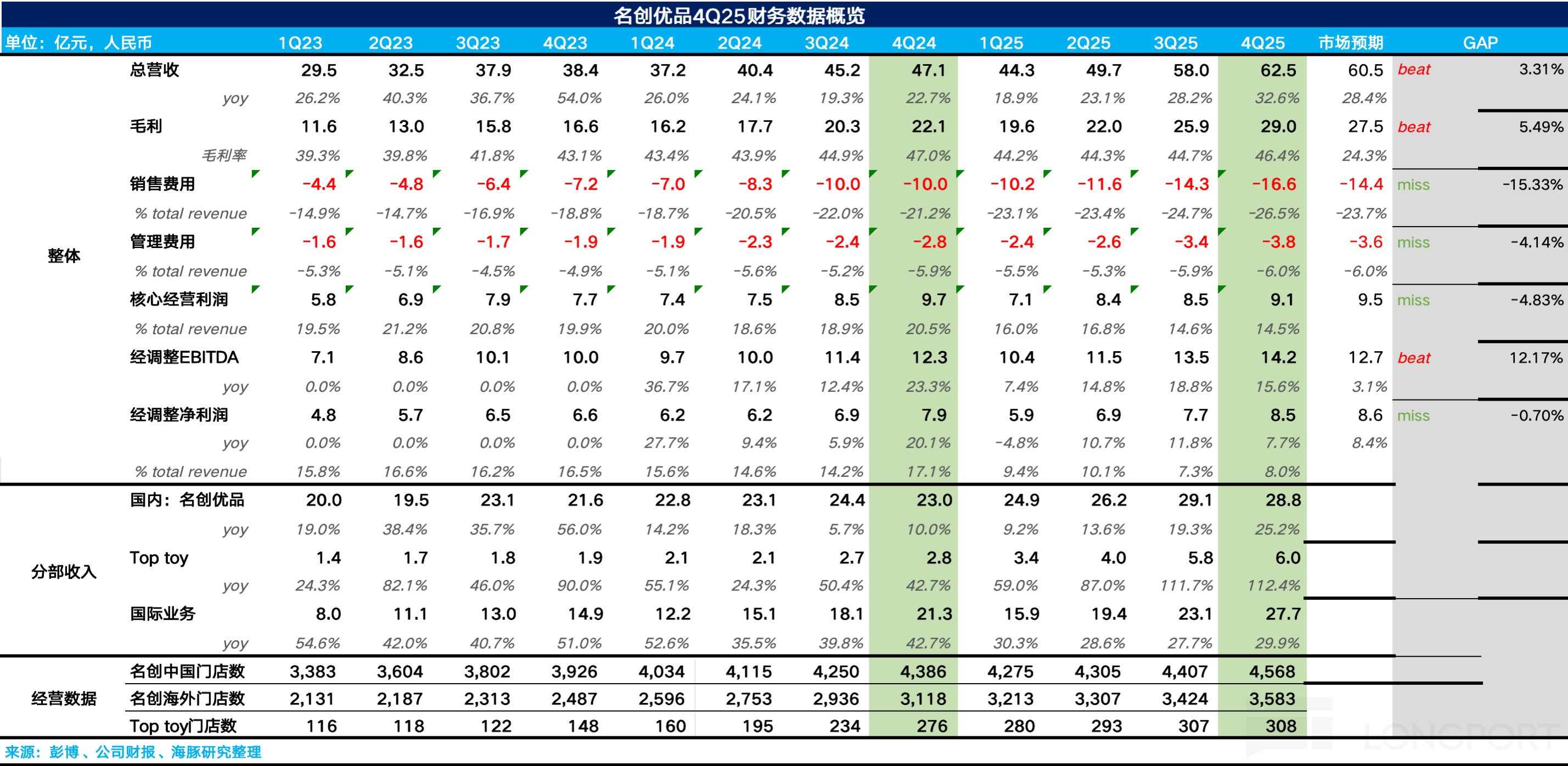 4Q25 名创集团层面实现总营收 62.5 亿元,同比增长 32.6%,超出了三季度公司给出的 20%-25% 的指引。