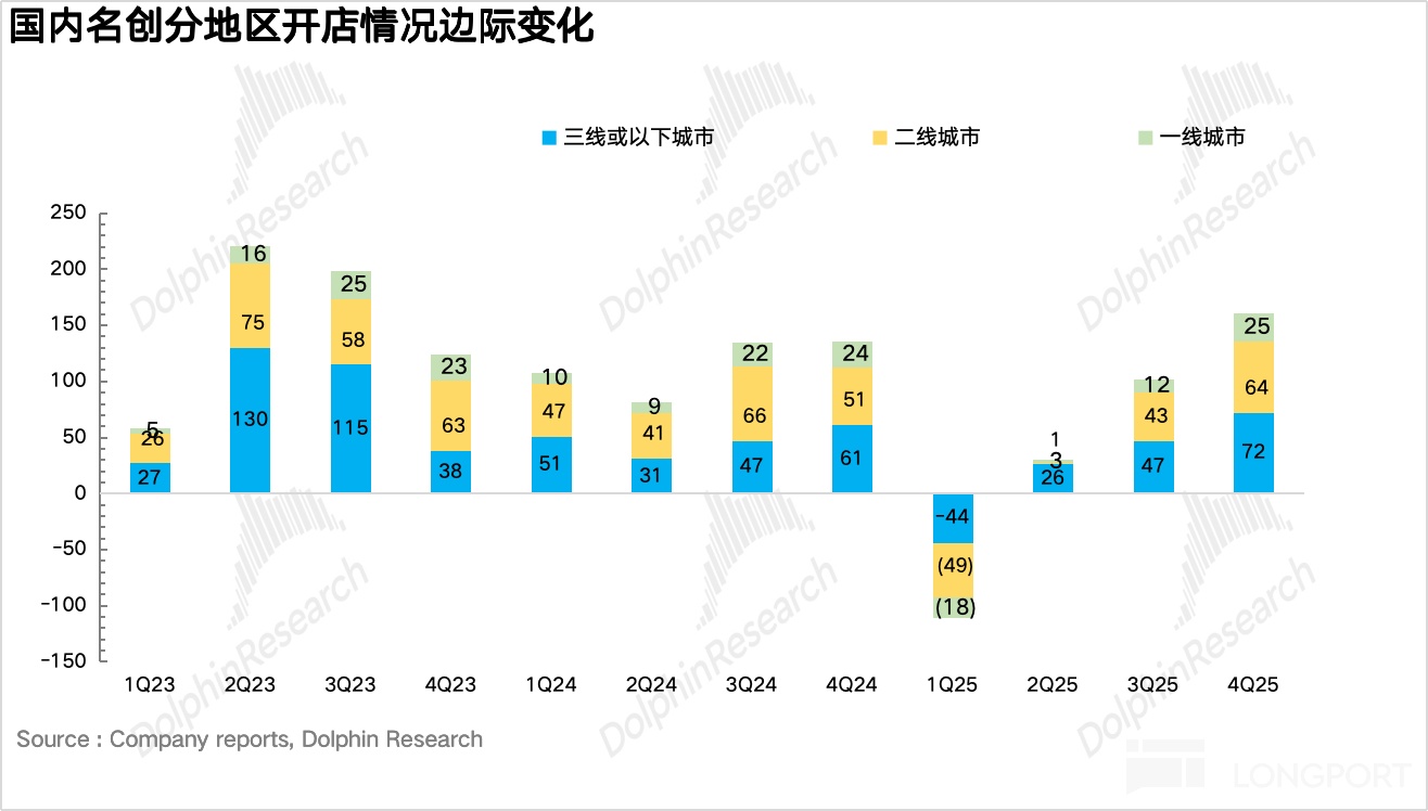 从开店节奏上,由于国内在一季度关停了大量低线城市的低店效门店导致了门店的负增长,二季度开始名创的开店速度环比提速,四季度达到年内开店高峰,以二线、三线及以下的下沉市场为主。