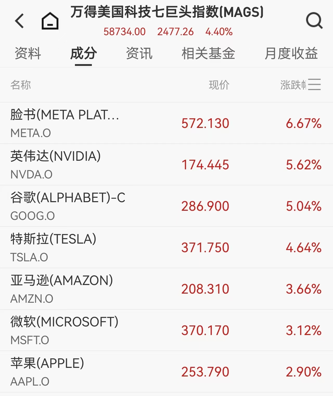 大型科技股成为反弹的主力军。万得美国科技七巨头指数整体上涨4.4%,其中Meta涨逾6.6%,英伟达和谷歌涨幅超过5%,特斯拉涨4.6%。